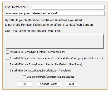 Alternatively, you can leave the default folder for Pimlical (probably better if you are going to use Pimlical from this point forwards), which follows the Windows Convention: C:\Users\{Your Windows Name}\AppData\Roaming\Pimlico\Pimlical. You will need to install Pimlical first to get the default folders setup (does not matter if you check that checkbox just to get it installed). Of course you won't see your data yet, but you can exit Pimlical and manually copy the four folders with your Palm data (Datebook, Todo, Address, Memopad) so they are the same level as the Pimlico folder in the above path (i.e. you should see the Pimlical, Datebook, ToDo, Address, Memopad folders all listed as sub-folders of the Pimlico folder). Then uninstall/reinstall Pimlical/Desktop so you get that initial install dialog displayed and this time, make sure you check the box to use the Old Palm/Desktop MDB Databases.
